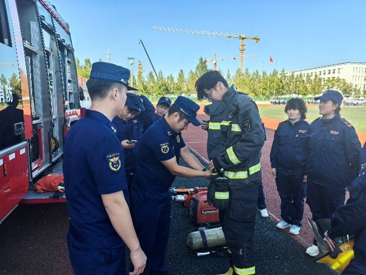 随后,各系学生代表在消防队员的带领下参观了消防救援车,逐一介绍了各类专业救援设备的名称、用途和操作方法。学生代表们近距离接触了平时难得一见的“消防神器”,并在消防员指导下试穿了防护服、消防自救呼吸器等消防装备,亲身体验了一次当消防员的感觉,加深了对消防工作的理解和认识。