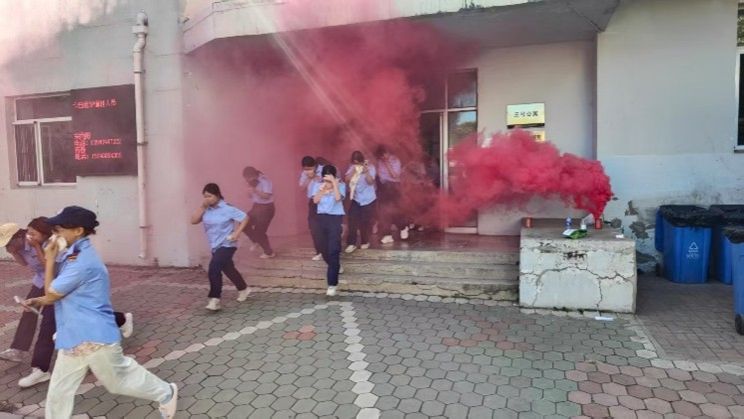 最后进行的是全员疏散演练。消防救援车拉响警报,各公寓门前同时点燃烟雾弹,模拟火灾现场。在宿舍管理员指引下,所有新生用湿毛巾捂住口鼻,低姿快速通过烟雾弥漫的楼道,从最近的安全出口有序疏散至指定安全区域,到达集合点后,各班级迅速清点人数并向指挥中心报告。