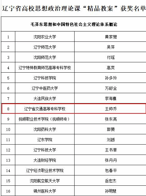 为深入贯彻落实《新时代高等学校思想政治理论课教师队伍建设规定》(教育部令第46号)的要求,用好教材、编好教案、讲好思政课,切实推动教材体系向教学体系转化,不断提升全省高校思想政治理论课教师教学水平,辽宁省教育厅在全省高校组织开展了思想政治理论课“精品教案”评选活动。近日,经专家评审,全省高校共有118人获奖。