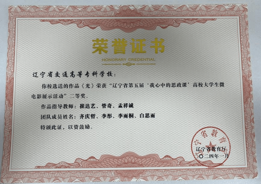 近日,辽宁省教育厅公布辽宁省第五届高校思想政治理论课情景微电影大赛活动获奖名单。由马克思主义学院思政课教师崔达艺、管奇、孟祥诚指导,学生团队齐庆哲、李彤、李雨桐、白思雨等共同完成的作品《光》获得二等奖。