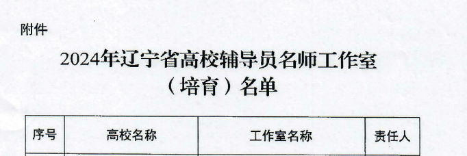 近日,辽宁省高校思想政治理论教育研究会公布了2024年辽宁省高校辅导员名师工作室(培育)名单,全省共20个工作室入选。我校学生工作处处长王楠老师辅导员团建办公室成功入选2024年辽宁省高校辅导员名师工作室(培育)名单。