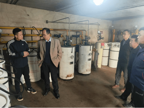 在燃气间,任冰书记详细了解了液化气罐的存储、使用,安全防护设施的检验及安全报警设施的配备和使用情况,要求一定要加强管理,持证上岗,规范操作,确保燃气安全。