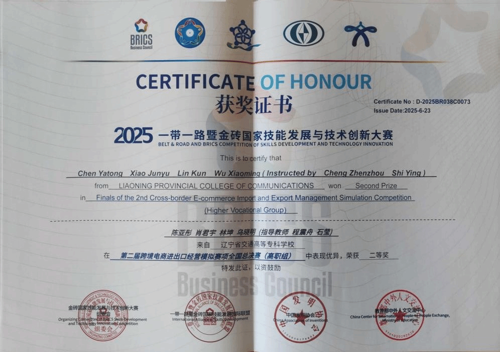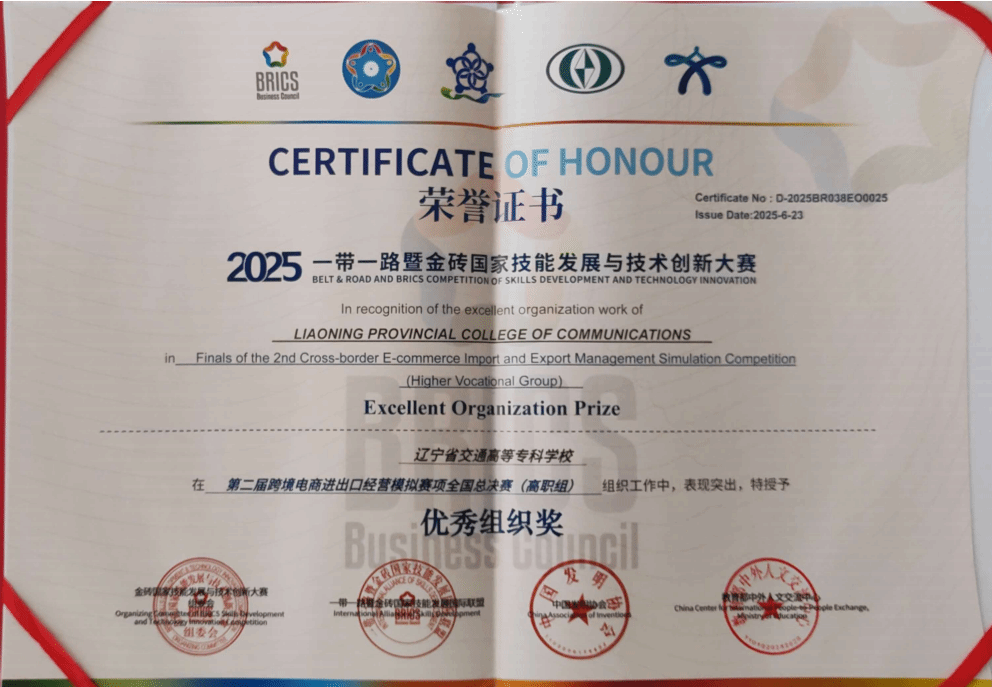 近日,2025“一带一路”暨金砖国家技能发展与技术创新大赛——第二届跨境电商进出口经营模拟赛全国总决赛(高职组)圆满落幕。我校物流管理系组建的参赛团队,在全国百余支强劲队伍的激烈角逐中脱颖而出,最终斩获全国总决赛二等奖,学校同步获评“优秀组织奖”。