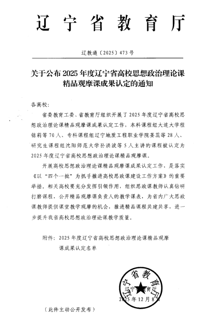 近日,辽宁省教育厅公布2025年度辽宁省高校思想政治理论课精品观摩课成果认定结果,我校2门课程成功入选,王帅乔主讲的《习近平新时代中国特色社会主义思想概论》、孙连任主讲的《毛泽东思想和中国特色社会主义理论体系概论》被认定为2025年度辽宁省高校思想政治理论课精品观摩课。