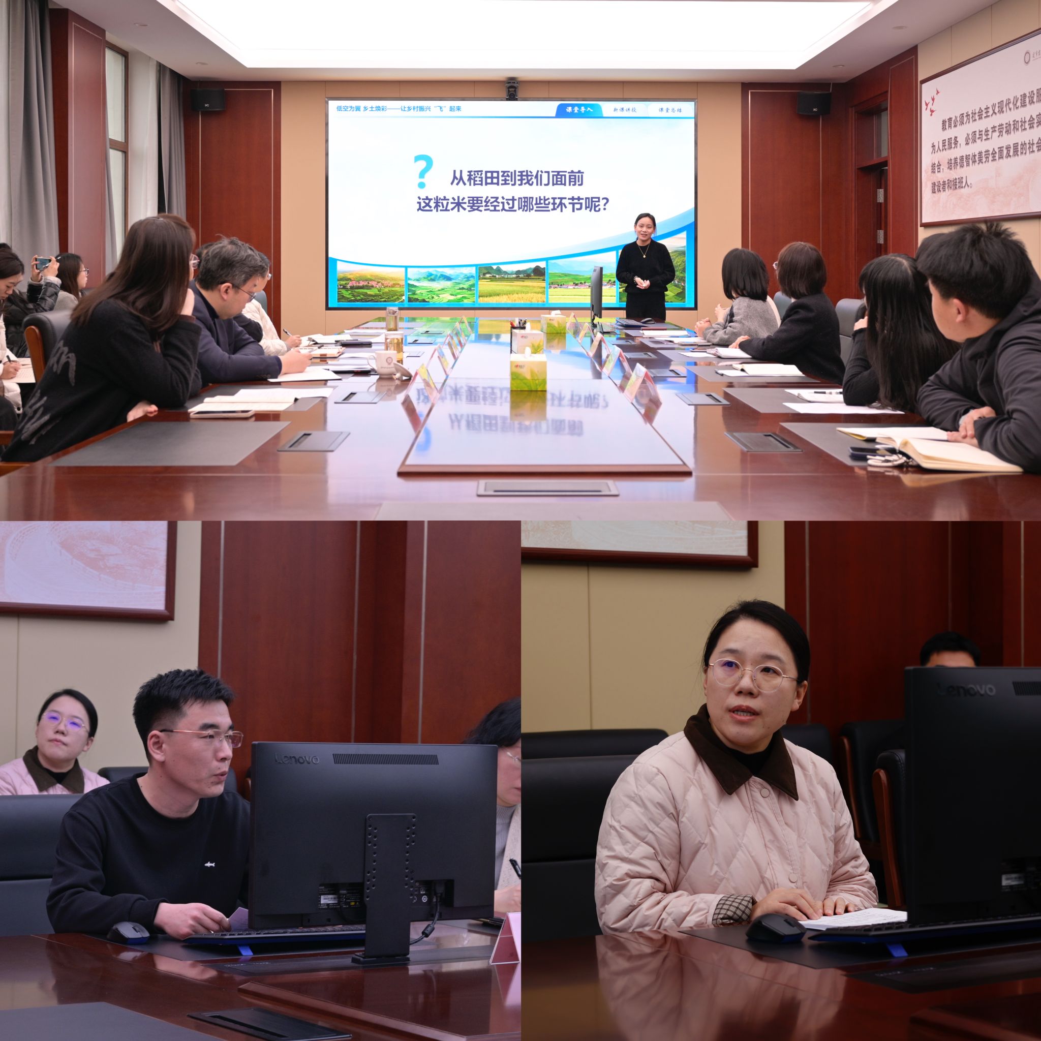 会上,马克思主义学院院长戴茹系统汇报了学院集体备课制度的建设成效、系列活动开展情况、现存不足与下一步工作规划。随后,赵微微老师和宋健老师分别以党的二十届四中全会精神融入课程内容课程评价的思考作专题汇报,深入探讨了党的创新理论融入思政课教学的方法路径与实践经验。在教学展示环节,陈天钰老师以《低空为翼,乡土焕彩——让乡村振兴飞起来》为题,生动演绎了党的二十届四中全会精神融入乡村振兴实践的教学案例,为课程教学创新提供了示范。