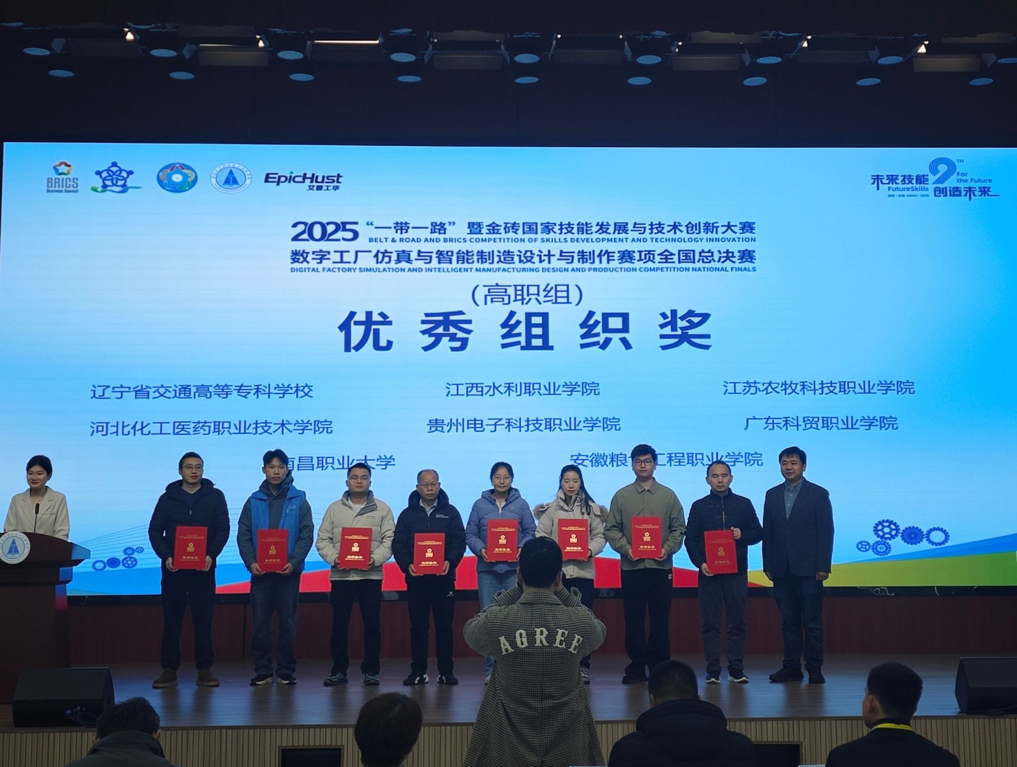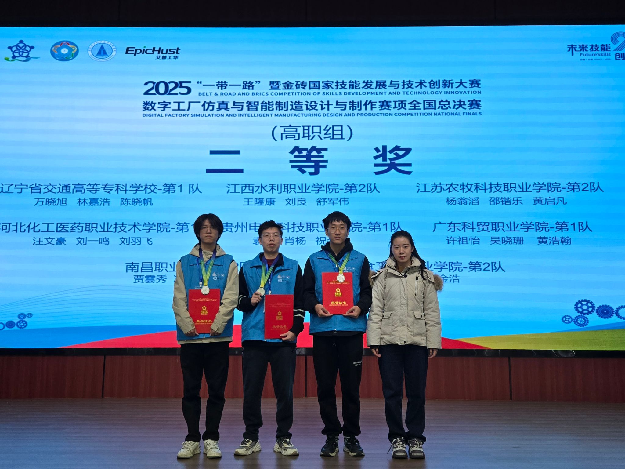 12月22日,为期3天的“一带一路”暨金砖国家技能发展与技术创新大赛之数字工厂仿真与智能制造赛项全国总决赛在安徽工业经济职业技术学院完美落幕。赛事汇聚全国60所职业院校的97支队伍同台竞技,展现技能风采。我校机电工程系代表队凭借扎实的技术技能、出色的团队配合协作与优秀的创新实践能力,在高职组比赛中脱颖而出,荣获二等奖,我校被授予“优秀组织奖”。