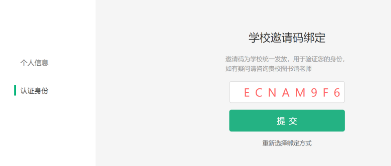 4.输入本校机构邀请码ECNAM9F6,点击提交,即可完成身份绑定。如“资料库”右下角打着绿色小对号,显示本账号已经绑定成功,不需要第二次绑定,一个账号只允许绑定一次,再点击不进行页面跳转。