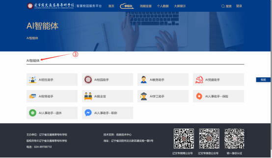 打开学校官方网站,在页面顶端点击“智慧校园服务平台”,登录后进入“AI能力中心”,即可选择需要的AI助手开启对话,我们同步还提供了AI知识库和AI工具供大家使用。