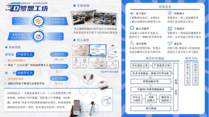 “梦想工坊”科技创新俱乐部是空间学院面向全校本科生开放申请的创新俱乐部。由西安蜂语信息科技有限公司CEO邵明绪担任产业导师、华山领军教授谢楷担任科研导师。俱乐部获得学校2023年度最佳科技创新俱乐部。招募对象要求为: