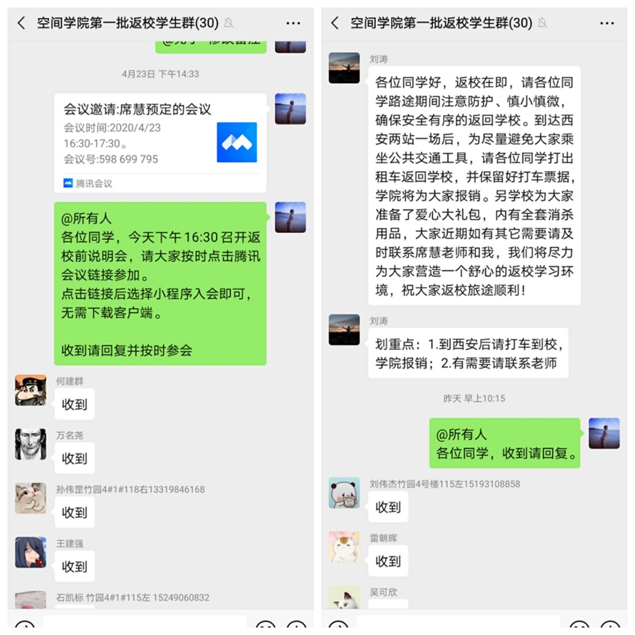 为确保每位返校学生知悉返校各项流程要求,4月23日,学院召开第一批返校学生在线视频会议,学院党委副书记刘涛和毕业生辅导员席慧向全体返校学生详细讲解《西安电子科技大学2020年春季返校须知》和允许返校的原则、返校申请流程、返校准备事项、返校注意事项、返校后的学习、生活安排等,对学生提出的疑问进行解答,特别强调了返校途中的人身安全、交通安全和防控安全,对于学校开学的各项保障措施进行宣传,帮助学生舒解不安情绪。