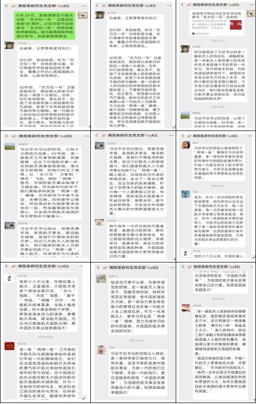 为了学习感受航天精神和老一辈科学家的家国情怀,空间学院测控通信研究生党支部于4月28日晚组织支部党员就回信内容和“两弹一星”精神进行线上学习,大家学习后都积极踊跃的发表了自己的想法,分享了航天精神对新时代的学子、对自己的影响与鼓励。
