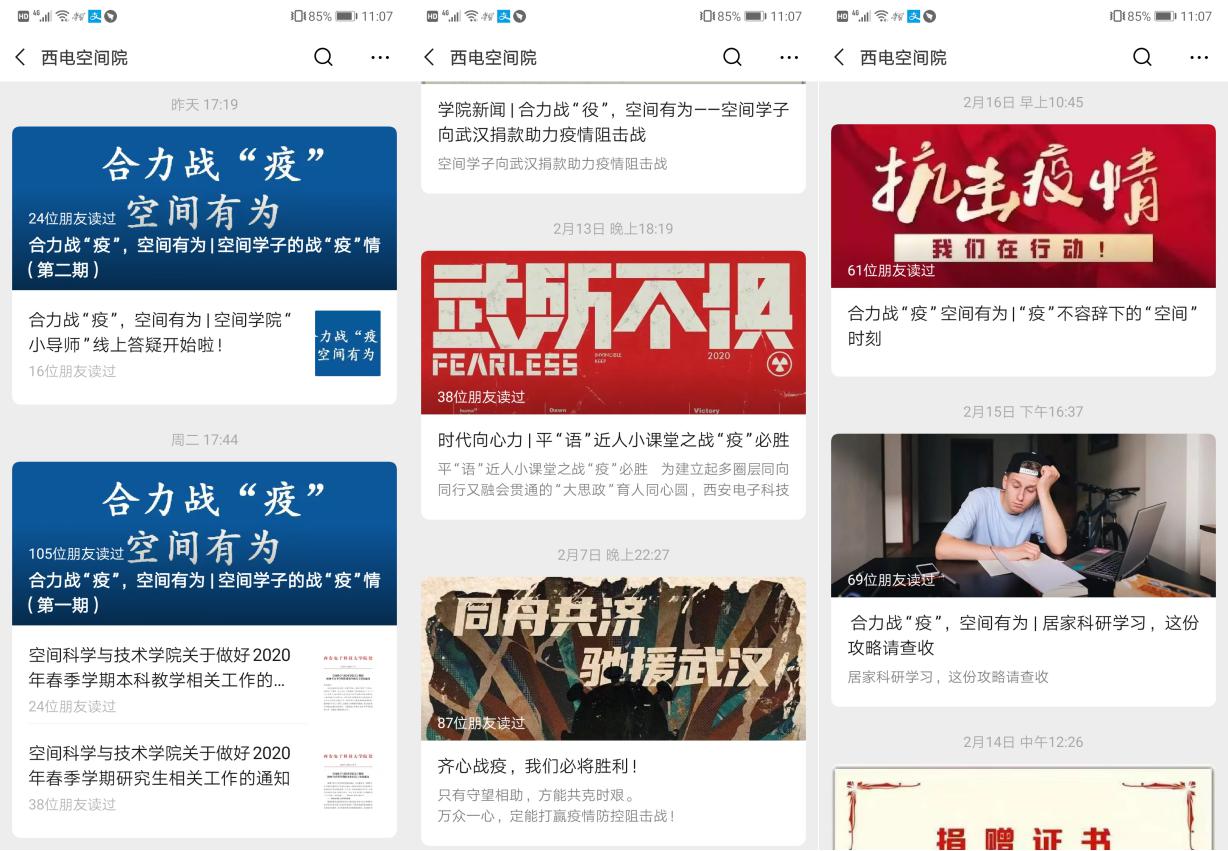 自新冠肺炎疫情出现以来,空间学院学工队伍全体在线、及时行动,第一时间完成了学生情况摸排工作,有针对性的对学生进行网格化管理,对关键学生进行一对一常态化关怀。同时,学工队伍依托微信公众号、抖音等新媒体平台传递正向积极能量、普及疫情防控方法、宣传师生志愿工作、分享科研学习攻略、展示学生原创作品,常态化开展以爱国主义教育和爱与感恩教育为主的线上思政,引导学生牢固树立战胜疫情的信心和决心。