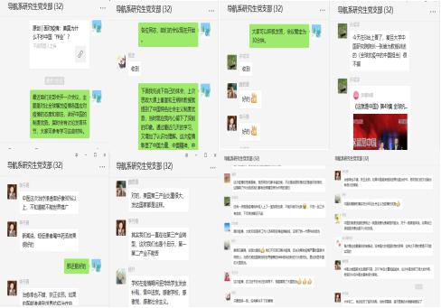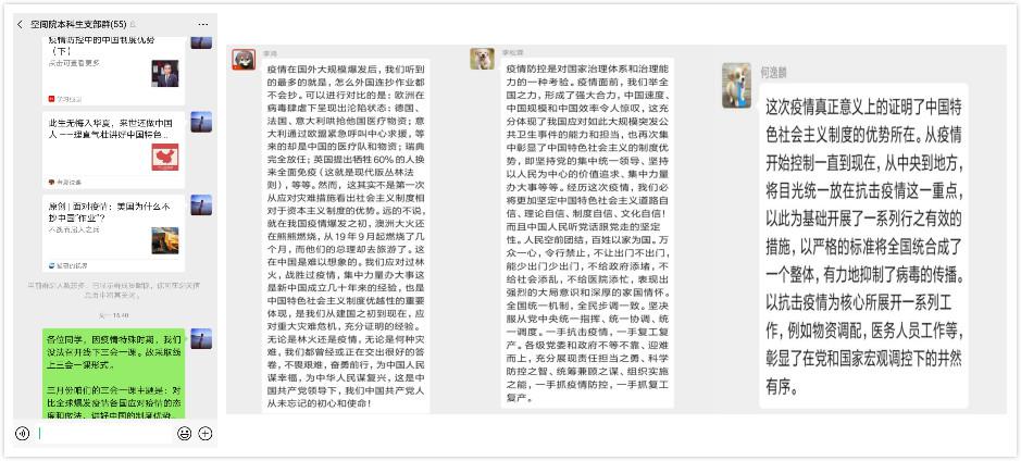 各支部以“对比全球爆发疫情各国应对疫情的态度和做法,讲好中国制度优势”为主题,采取“网络学习+线上讨论”的方式开展党课。通过线上观看学习强国平台内《疫情防控中的中国制度优势》专题视频和夏永林教授关于《战疫中彰显中国特色社会主义制度优势》线上直播,全体党员同志对我国的制度优势有了更加深入的思考,爱国情怀更加入脑入心。学习期间,学生党员纷纷在各支部微信群内分享心得,展开讨论。