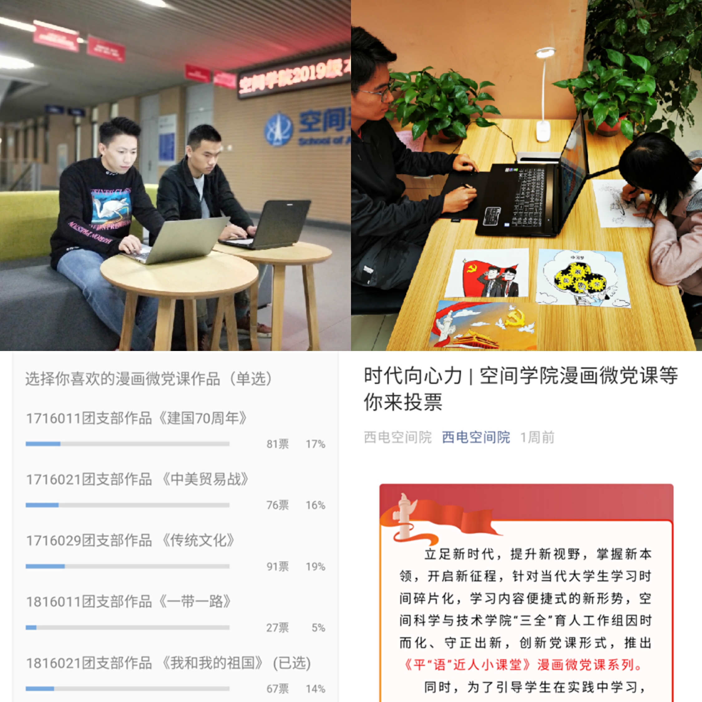 空间学院组织学生团支部开展漫画微党课大赛,引导青年学生践行使命担当,展示昂扬向上的精神风貌,用画笔向祖国献上祝福。10月3日至6日,学院对学生团支部创作的主题漫画微党课进行线上集中展示和人气评选,共计740余次浏览,460余人次参与了投票。