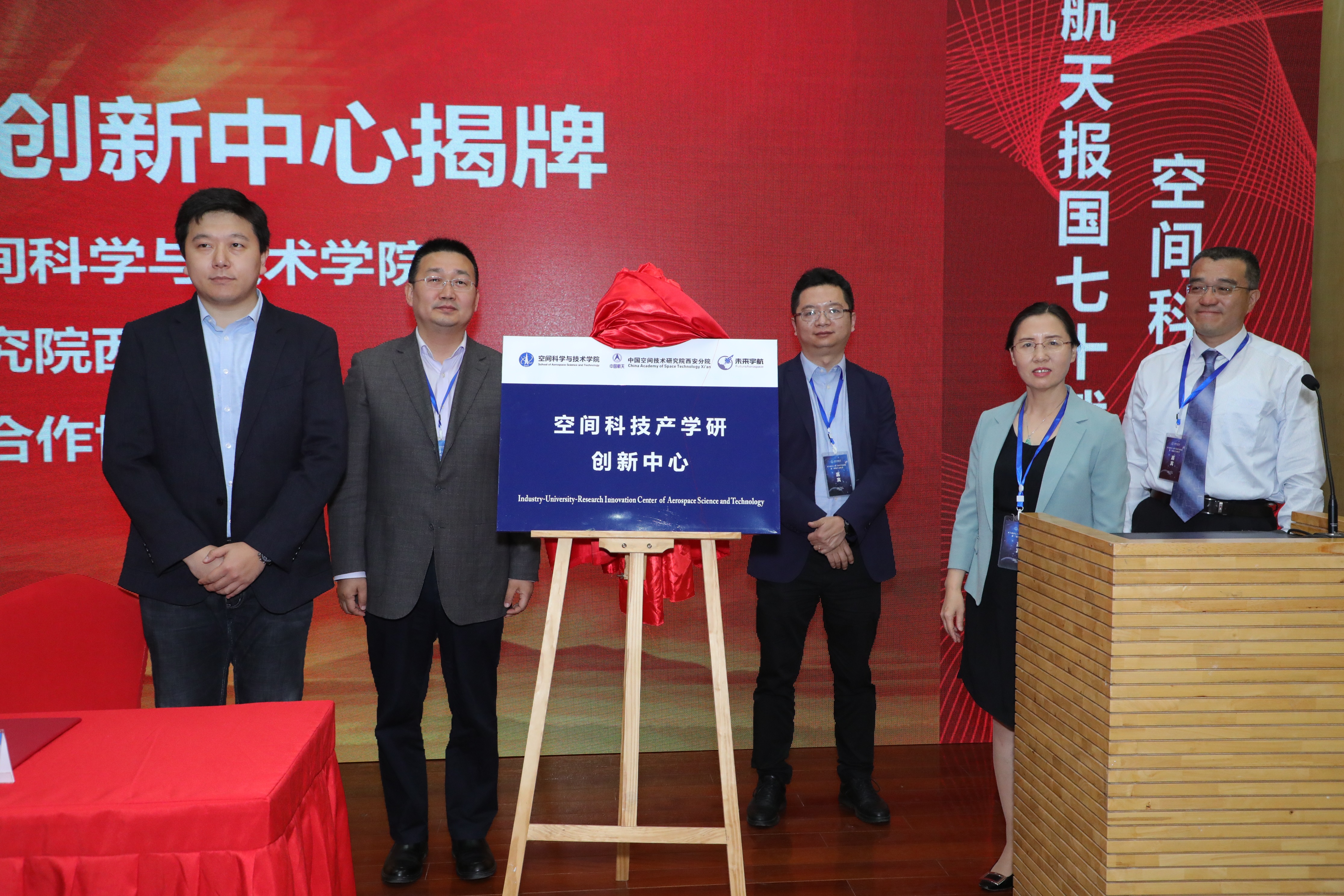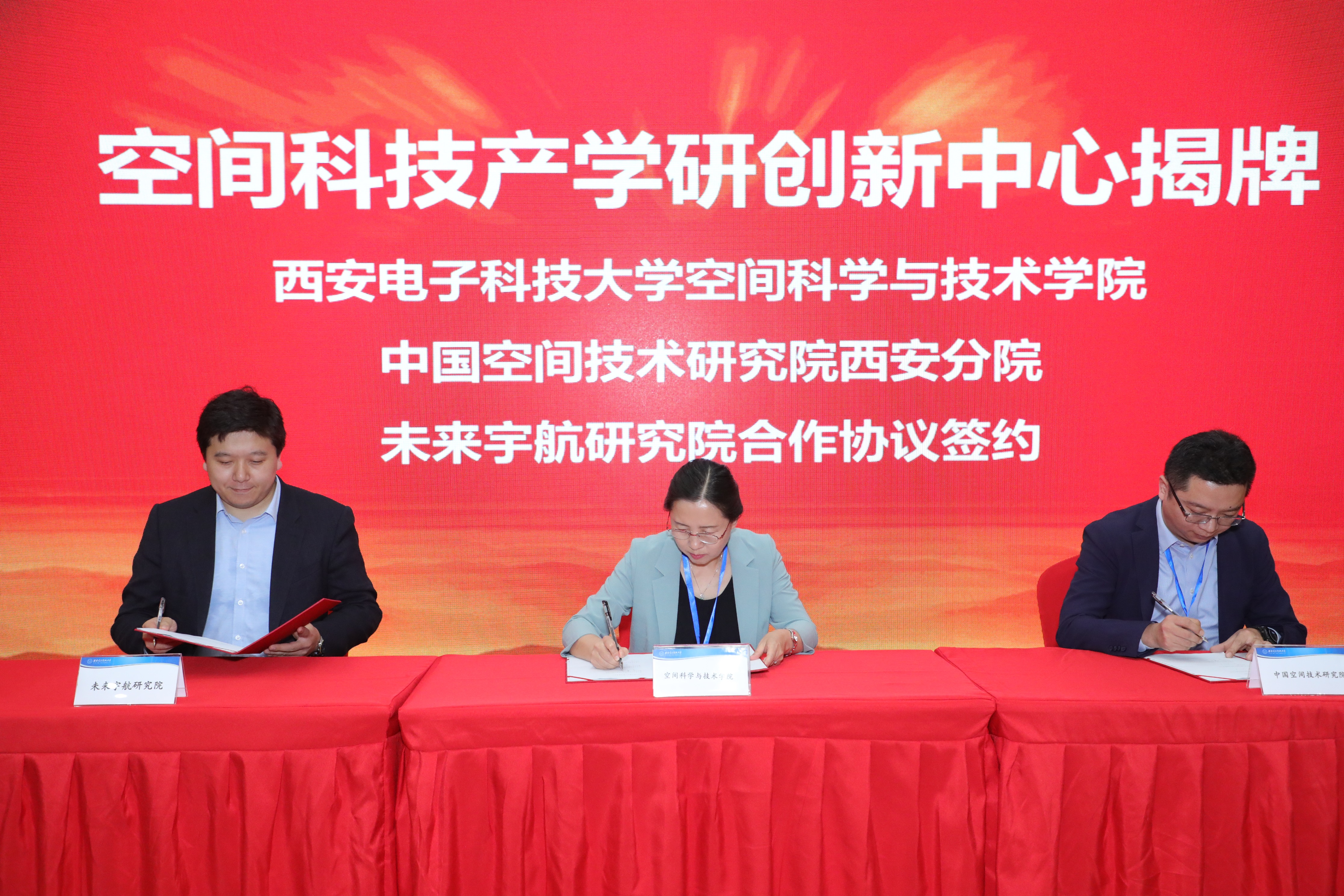 陕西省科技厅副厅长兰新哲、中国航天科技集团院士包为民、中国空间技术研究院西安分院院长李军与西安电子科技大学空间科学与技术学院执行院长李小平共同为先进空间科学载荷联合实验室揭牌。中国空间技术研究院西安分院市场研发部副部长董坚、未来宇航研究院创始人牛旼与西电空间院执行院长李小平代表三方共同签约,共建空间科技产学研创新中心。中国空间技术研究院西安分院副院长李立、相关航天科技合作公司和空间科学与技术学院师生代表共同参加签约揭牌仪式。