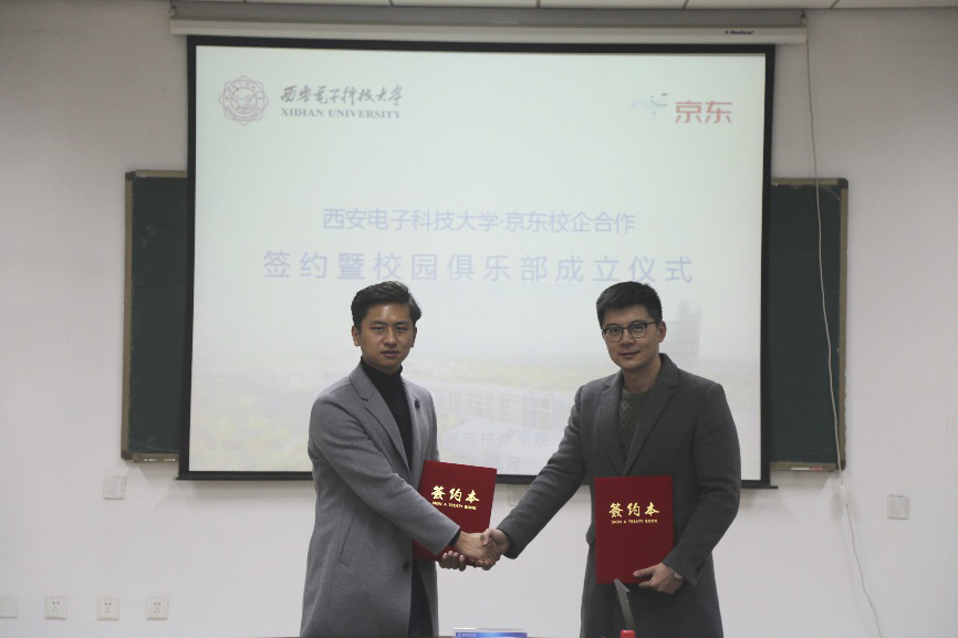 刘涛和郑炎分别代表双方签署了校企合作协议。朱文凯和樊琪共同为西安电子科技大学京东校园俱乐部揭牌,宣布俱乐部正式成立。