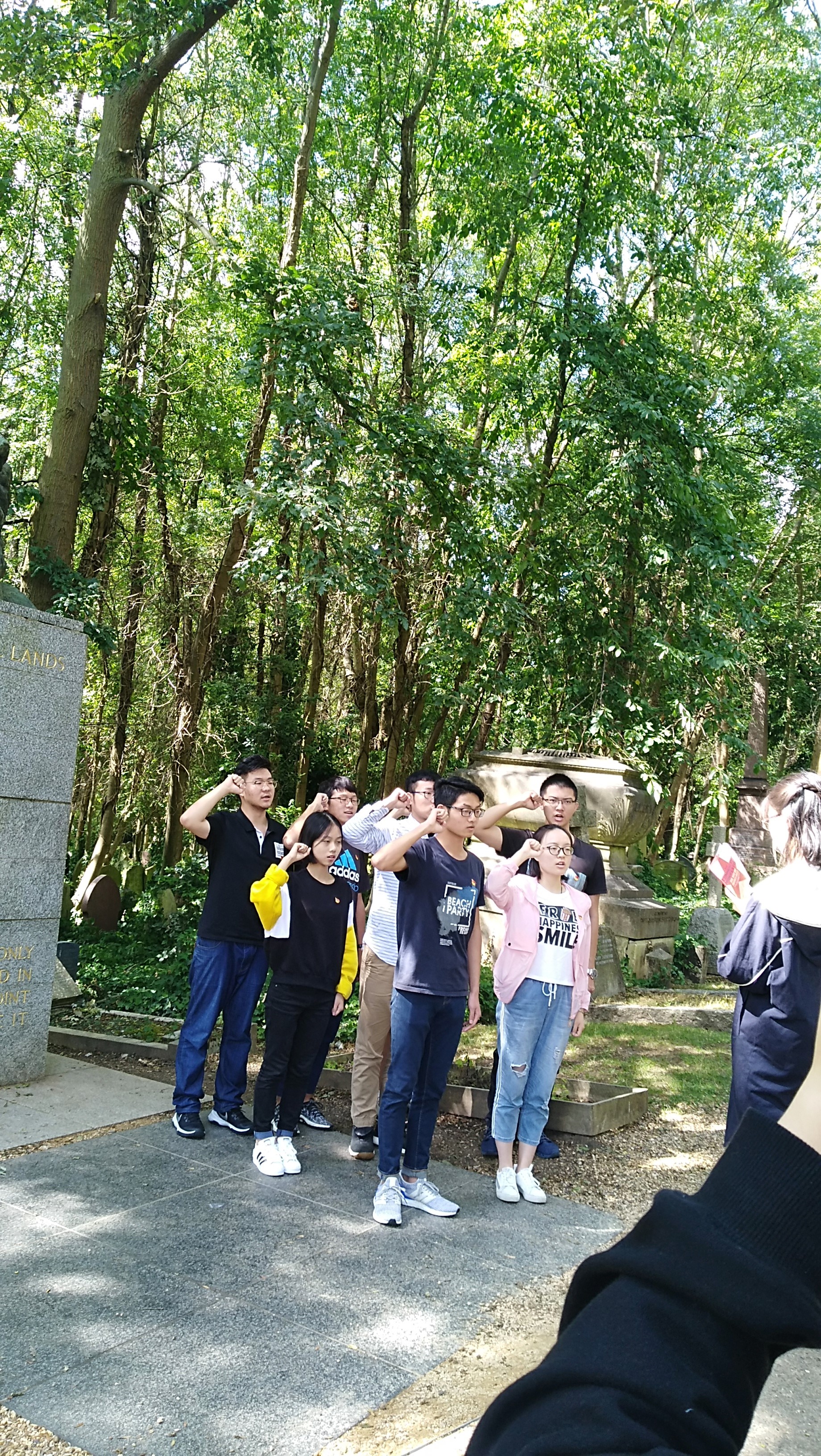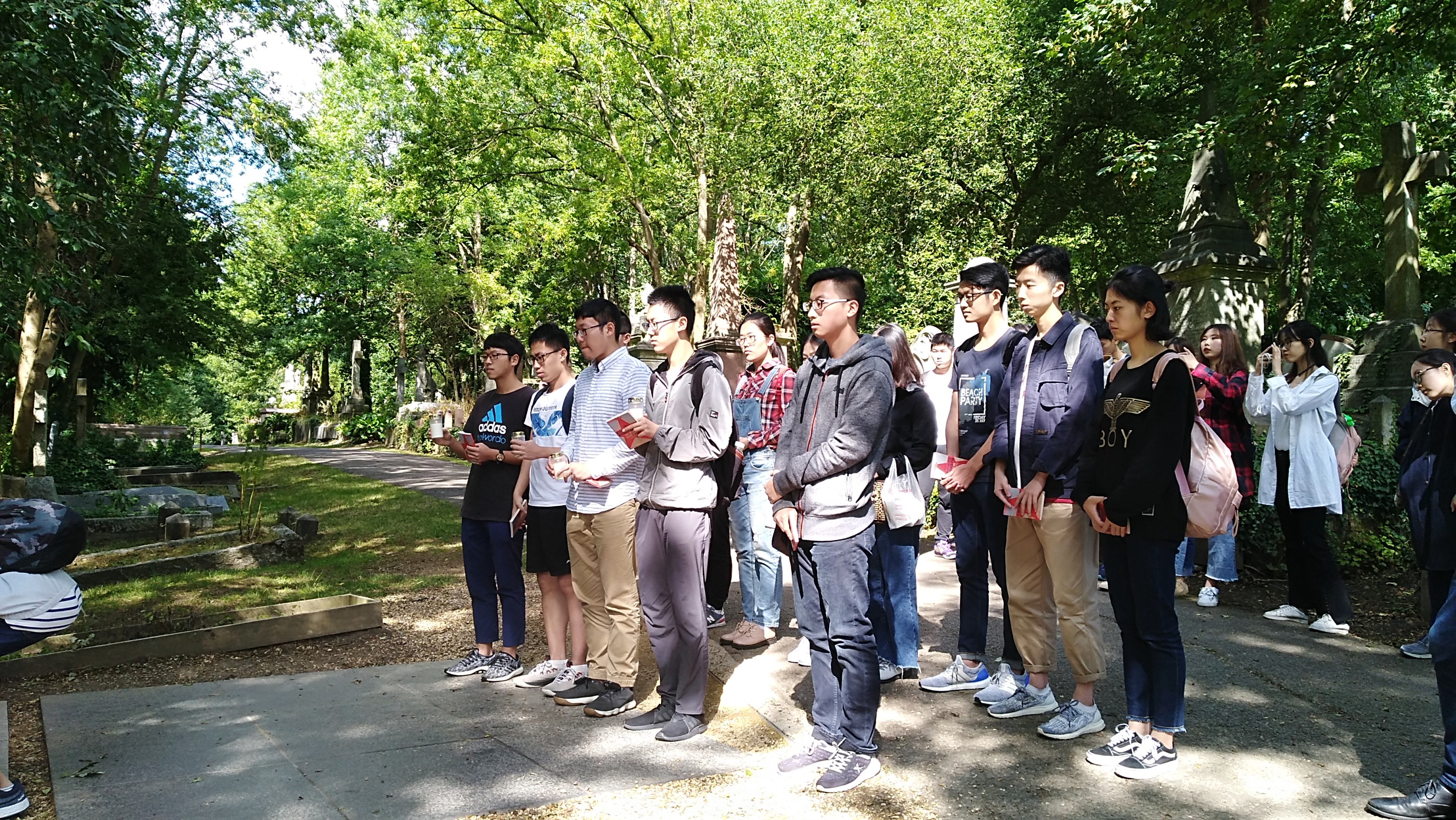此次赴英访学,正值伟大的无产阶级领袖马克思诞辰200周年,为此,西电师生一行人特意来到马克思公墓拜谒。学生代表在墓前献上白蜡,师生集体低头默哀。大家在马克思墓前共同回顾共产党宣言的著名选段,集体重温入党誓词。在这位伟大无产阶级领袖的雕像前,西电师生深色庄重,誓言铮铮,展现了“三有西电人”良好的精神风貌和红色继承人的责任心。