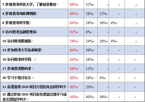 学生对CDIO项目中各个活动的满意度评价很高。对于项目中安排的《互联网+时代初创体验》课程和访问香港金融管理局的活动满意度最高。满意度次之的是《电子商务》课程、参观香港大学校园和参观香港数码港的项目。学生对于科技前沿的内容比较感兴趣,满意度也较高。但仍有部分项目工作需要改善。部分学生建议学校要多开展此类交流活动,设立相关奖学金,积极鼓励学生出国访学、游学。并且活动不应该仅仅局限在亚洲,要有全球视野。目前学校对此类对外交流活动大力支持,凡参与此活动的同学均能获得了资助奖励。