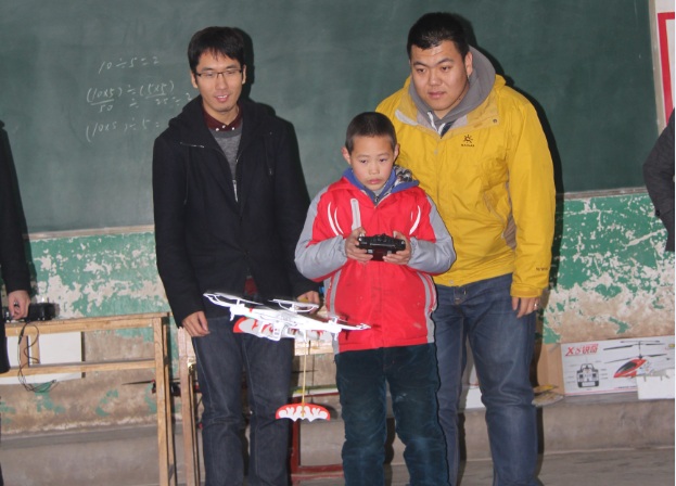 12月9日上午,空间科学与技术学院师生代表十余人邀请前西安爱乐合唱团团长王虹老师一起,冒着大雪来到蒲城县荆姚镇九年一贯制学校。他们为学校捐赠了大约300余本少儿国学经典读物,设立了爱心图书馆,组建了“诵读国学经典班”,带领孩子们学习《弟子规》;捐赠4架遥控直升机和60套拼装手抛式航模以及天宫1号和车载导弹模型各一套,帮助学校组建了“放梦蓝天”少年航模队,当前大学生们还为孩子们进行了一场精彩的飞行表演。