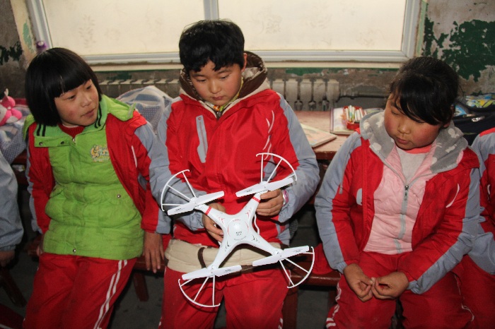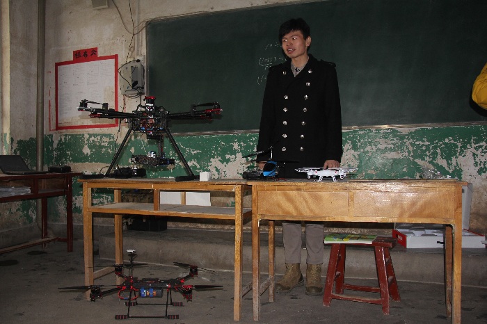 (图为支教学生介绍展示4轴、6轴飞行器,并做飞行表演)
