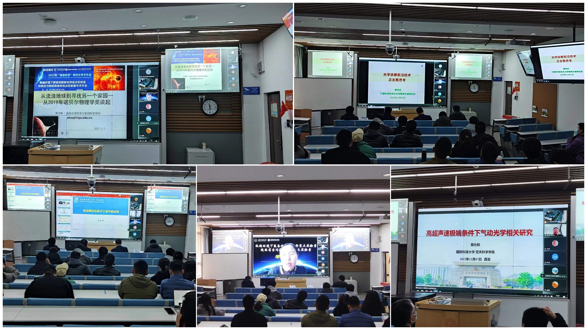活动邀请国防科技大学易仕和教授、南京大学周济林教授、北京航空航天大学李惠峰教授、西安光学精密机械研究所樊学武研究员和航天科技集团五院西安分院李浩研究员等五位专家做学术报告。五位专家围绕太赫兹遥感技术、轨迹规划技术、高超声速气动光学研究、光学侦察载荷技术及系外行星探测技术等方向,系统梳理了相关技术的研究背景、发展现状,深入探讨其在航空航天领域的应用场景与未来布局。专家们的报告高屋建瓴、聚焦前沿,报告内容与重点实验室研究方向以及学院十四五重点领域高度契合,引起了线上线下人员的广泛共鸣同时也拓展了学院青年教师及研究生的学术视野。