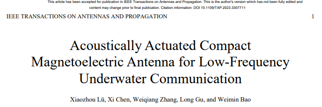 (通讯员 吕晓洲)近日,天线领域国际著名学术期刊《IEEE Transactions on Antennas and Propagation》(中科院二区Top,IF=5.7)在线发表西安电子科技大学空间科学与技术学院柔性传感技术研究所吕晓洲教授团队的最新研究成果“Acoustically Actuated Compact Magnetoelectric Antenna for Low-Frequency Underwater Communication”(DOI: 10.1109/TAP.2023.3307711)。该研究提出了一种基于声驱动的小型化低频磁电(ME)天线(频率:91.8 kHz,尺寸:14*6*0.5 mm3),利用磁电耦合效应实现“磁-声-电”三个物理量之间的相互转换,验证了ME天线用于水下无线通信的可行性,有望为海洋通信探测提供新思路。团队吕晓洲教授和陈茜博士为该论文共同第一作者,吕晓洲教授为论文通讯作者。