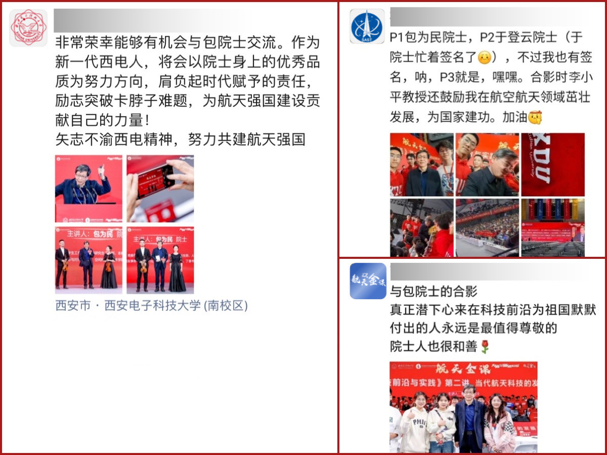 丁香书院电子信息大类学生郭鹏飞谈到:“包为民院士对于很多深奥的航天科技原理讲述的非常透彻,本堂课程的学习不仅让我加深了对于空间科学的认识,航天强国建设也不再仅仅是一个宏观的概念,仿佛成为了一条条具体的现实路径,对于我们而言,可能就是要先从上好每一门基础课开始。”丁香书院电子信息大类学生杨悦彤在朋友圈晒了和包院士的合影,并配以文字“真正潜下心来在科技前沿为祖国默默付出的人永远是最值得尊敬的。”2022级钱学森空间科学实验班的徐程靖则是在朋友圈用“我也是和包院士有合影的人了”分享了自己“追星”激动的心情。