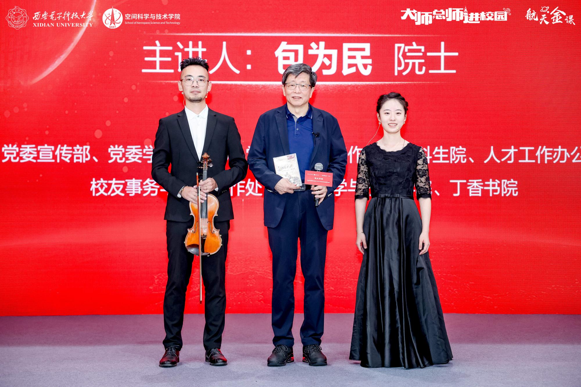 时值学校92周年校庆,学生代表在课程结束后也为包为民“学长”送上了情谊满满的礼物,在悠扬的小提琴演奏曲中,学校大学生交响乐团的本科生王欣禾和博士生李祯煜为包为民院士献上了西电首部校园文化精品《长征组歌》首演实况光盘,向作为曾经小提琴社一员的包为民院士发起了“科学与艺术”合奏之约。包为民院士回忆到:“当时我是班里的文体委员,喜欢丰富大家的业余生活,刻苦学习的同时,劳逸结合也是非常重要的。”