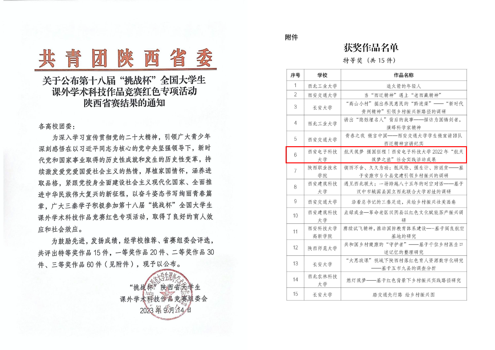 (通讯员 郑瑞博 李小军)近日,第十八届“挑战杯”全国大学生课外学术科技作品竞赛红色专项活动陕西省赛落下帷幕,空间科学与技术学院申报的《航天筑梦 强国征程丨西安电子科技大学2022年“航天筑梦之旅”社会实践活动成果》斩获特等奖。