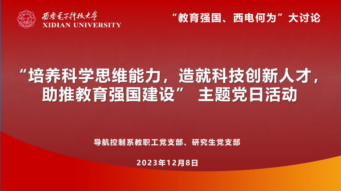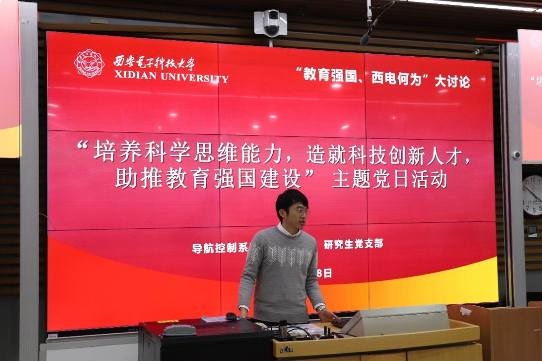 (通讯员 智斌亮)为深入学习习近平总书记在中共中央政治局第五次集体学习时的重要讲话精神,不断增强教育强国建设的思想自觉、政治自觉、行动自觉,以大讨论汇共识、聚智慧、促实干,12月8日上午,空间科学与技术学院导航控制系教职工党支部联合研究生党支部开展“培养科学思维能力,造就科技创新人才,助推教育强国建设”主题党日活动,活动由导航控制系教职工党支部书记戴浩主持。
