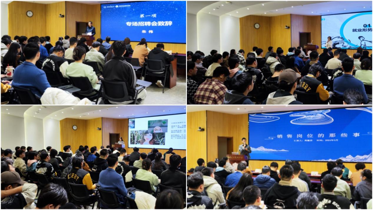 詹奉珍以“就业能力提升指导”为题,依托近年来本校和行业内高校毕业生就业数据,深度剖析了企业招聘需求内核和个人求职胜任要素的辩证关系。她以“企业招聘最合适的人,而非最优秀的人”为切入点,鼓励同学们明晰个人优势、突破求职障碍,抓住春招黄金期,把握就业主动权。已签约毕业生马戈和周鑑清分别从技术和营销岗出发,结合自身实习感受,展开求职就业全流程分享,助力24届毕业生取得满意offer。
