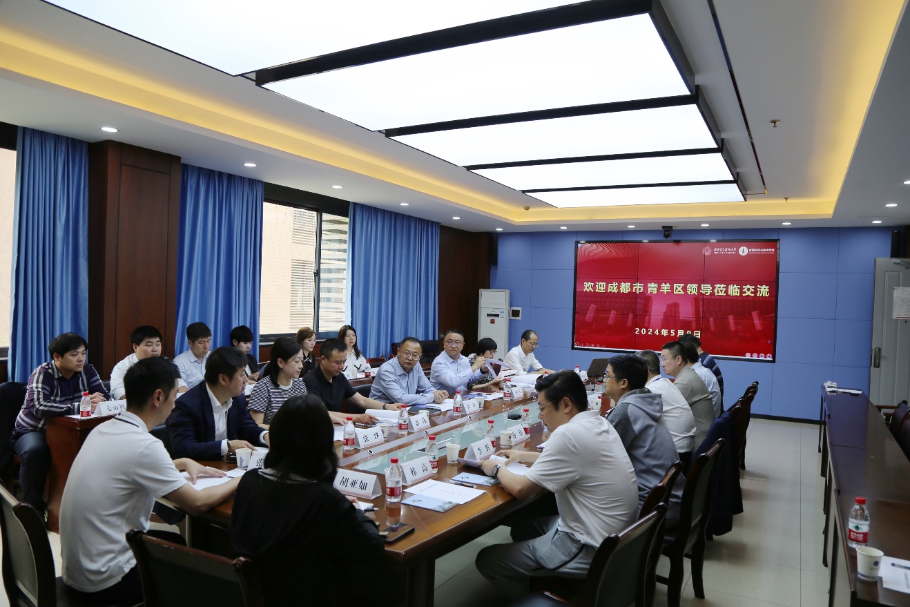 (通讯员 尚保强)5月9日下午,成都市青羊区区委书记何勋、副区长龚昌华一行来校调研,围绕政产学研合作以及科研平台共建进行座谈交流。民建成都市委、成都市交通投资集团有限公司,青羊区新经济和科技局、投资促进局、工业创新设计功能区管委会、航空新城公司以及相关企业负责人,学校科学研究院技术转移中心以及学院相关教师代表参加会议。会议由执行院长刘彦明主持。