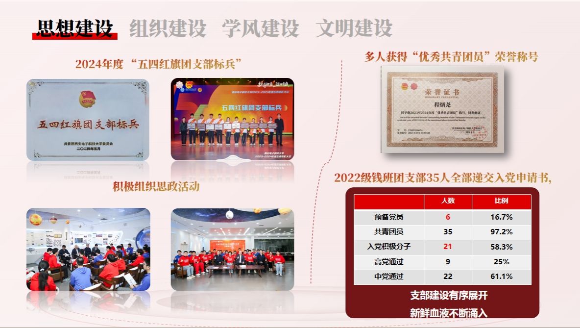 思想建设引领,信念坚定。2022级钱学森班共有36人,全部递交入党申请书。现有预备党员6人,发展对象3人,入党积极分子21人,多人获评“优秀共青团员”,班级在2024年度五四评优中获得了“五四红旗团支部标兵”荣誉称号。2022级钱学森班坚持培育学生坚定的科技报国理想信念,围绕习近平总书记关于教育的重要论述及重要讲话开展热议,积极举办内涵丰富形式多样党课团课学习,引导青年学子踔厉奋发,挺膺担当。