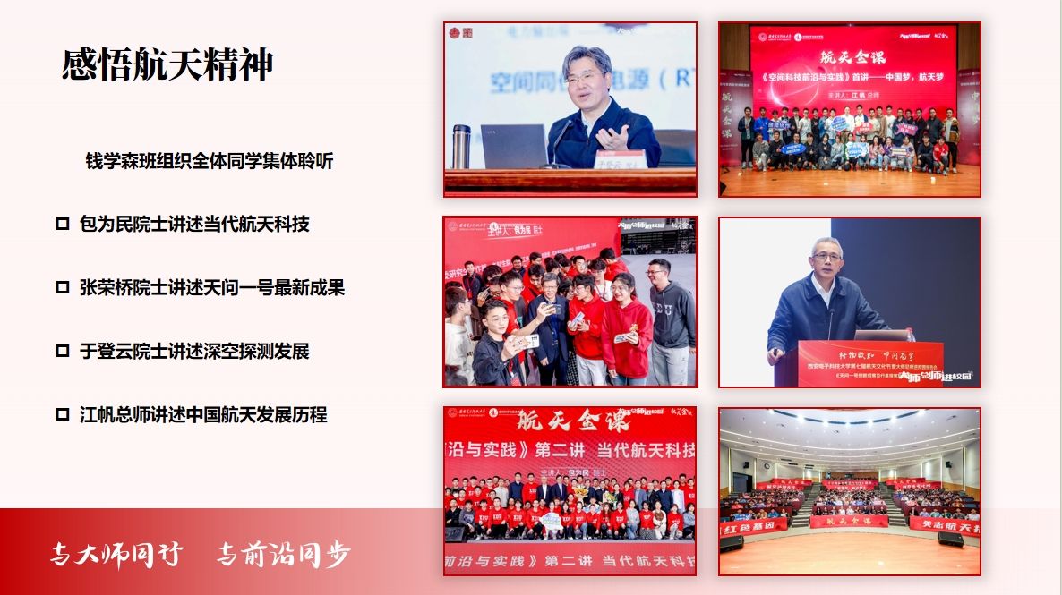 精神文化熏陶,培根铸魂。2022级钱学森班坚持赓续红色根脉,厚植家国情怀,以航天精神和钱学森精神为理想航标和价值追求。班级以“航天文化节”和《空间科技前沿与实践》课程等为载体,邀请包为民院士、于登云院士、张荣桥院士、武向平院士等大师总师与学生面对面交流座谈,持续深化文化浸润,弘扬航天文化,让科技报国、航天报国成为学生的价值追求和行动自觉,为建设航天强国汇聚磅礴力量。
