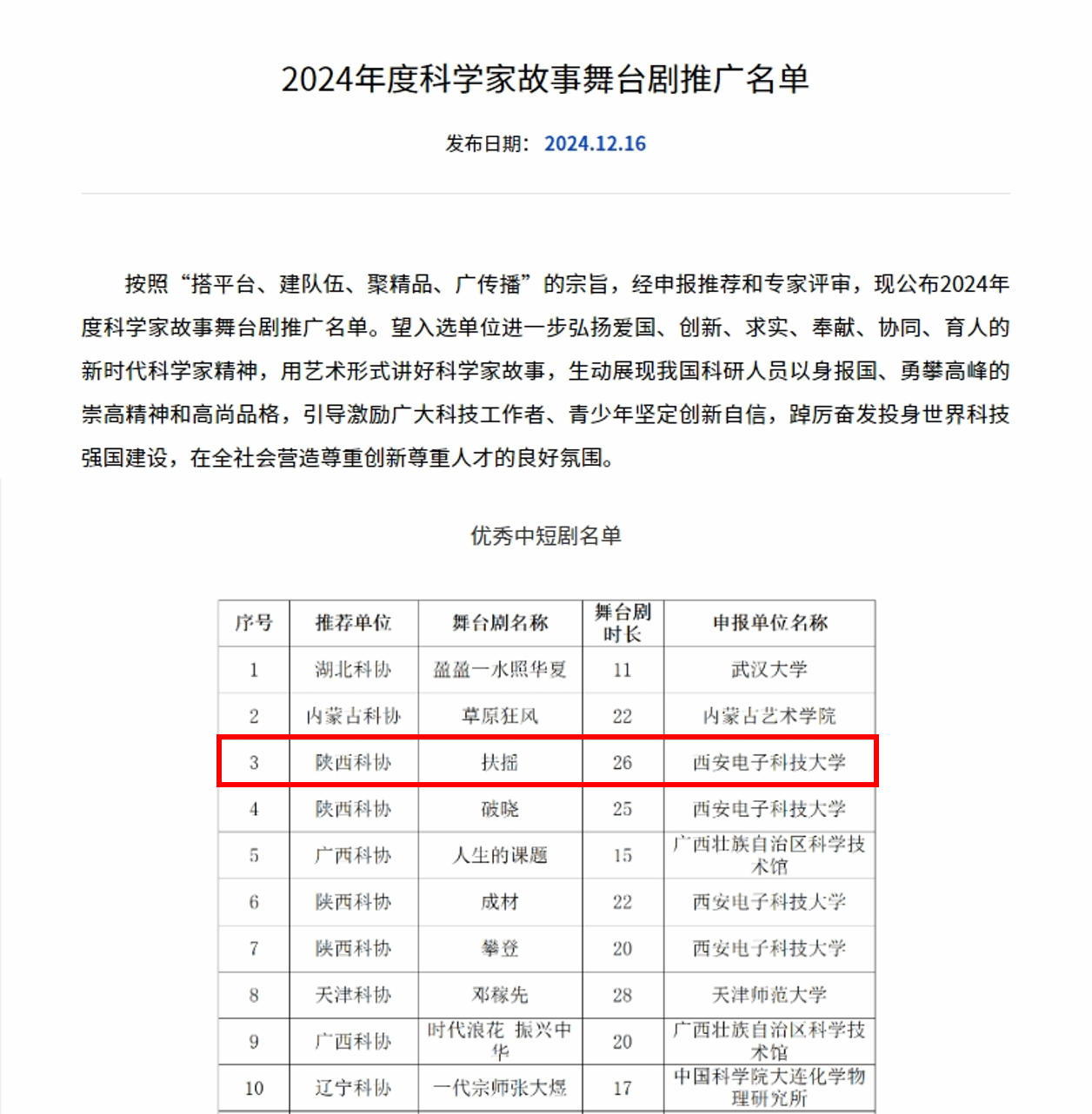 近日,中国科学技术协会公布了“2024年度科学家故事舞台剧推广名单”,空间科学与技术学院原创舞台剧《扶摇》成功入选,获评“优秀中短剧目”。