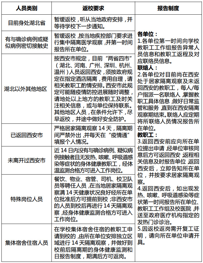 为切实做好疫情防控和有序返校返岗,保障开学后各项教育教学工作有序开展,所有教职工(包含临聘人员,湖北地区除外)到校工作时间原则上须早于学生返校时间。近14天“疫情通”连续上报均无异常情况的教职工,在保证安全和条件允许前提下尽量在3月1日前返回西安。返回西安后,应严格按照西安市和所在社区的隔离要求进行为期14天的居家隔离,每天在“疫情通”填报个人情况,开学前14天内无发热、咳嗽、呼吸道感染等症状的教职工方可进入工作岗位。