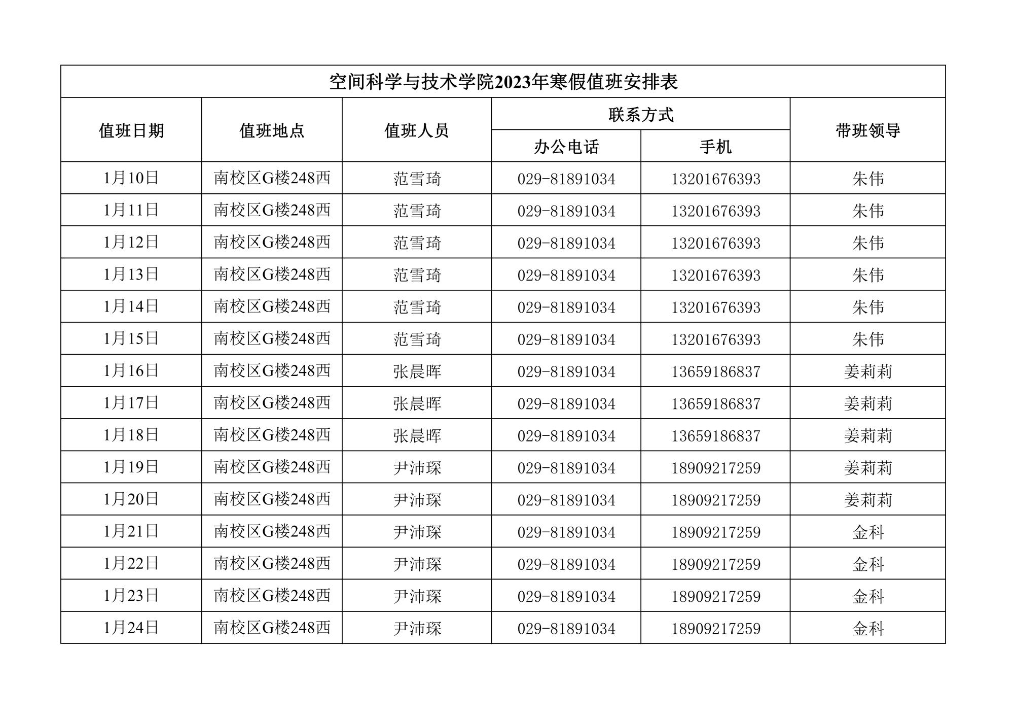 空间科学与技术学院2023年寒假值班安排表
