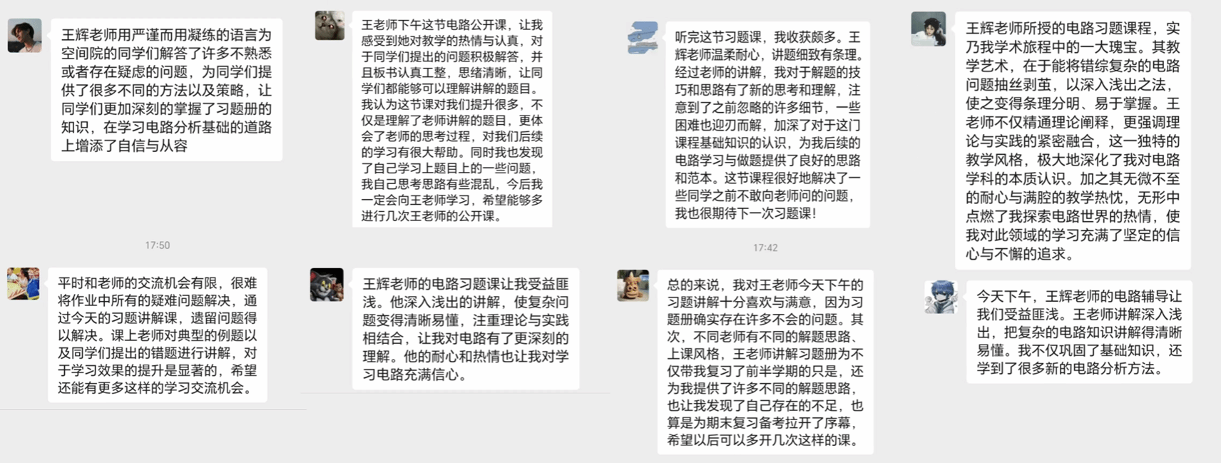 学生们对于本次活动反馈积极,纷纷表示受益匪浅。通过王老师的指导,他们学习到了如何从整体框架入手,分步骤解题,避免过度关注个别计算细节,这大大提高了他们解题的效率和准确性。部分同学分享道:“王辉老师所授的电路习题课程,实乃我学术旅程中的一大瑰宝。其教学艺术,在于能将错综复杂的电路问题抽丝剥茧,以深入浅出之法,使之变得条理分明、易于掌握。王老师不仅精通理论阐释,更强调理论与实践的紧密融合,这一独特的教学风格,极大地深化了我对电路学科的本质认识。加之其无微不至的耐心与满腔的教学热忱,无形中点燃了我探索电路世界的热情,使我对此领域的学习充满了坚定的信心与不懈的追求。”总体而言,同学们普遍反映,本次活动不仅帮助他们更好地理解了电路课程中的重点难点,更重要的是,他们从老师的授课中获得了自信和动力,表示今后将更加注重理解和思考,在解题过程中更加注重逻辑性和系统性。
