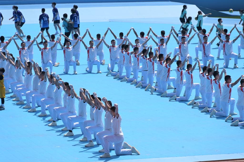 全省共有六所高校参与开幕式演出,我校400余名警士学员受邀全过程参加大赛开幕式表演,多个展演环节中担任中坚力量,展演节目覆盖每个篇章,是参与节目最多的高校。共有10人参加撞球、搏击操、板羽球、手抛球系列序章表演。40人参与了第二篇章彩带龙表演。分别有230人参与了第三篇章的广播操表演和130人参与了第三篇章的氛围营造队形变换表演。90人参与了第四篇章彩旗表演。