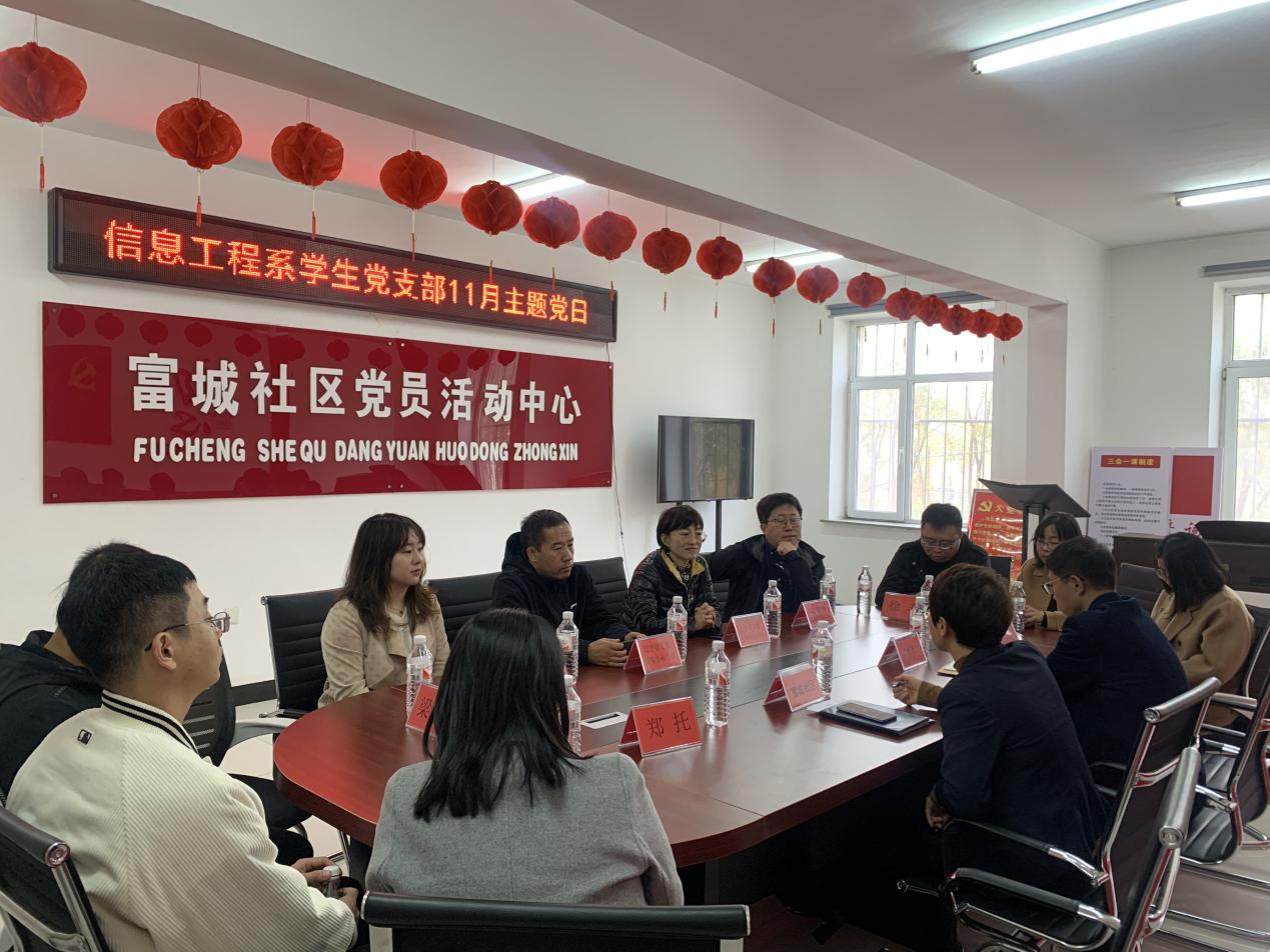 富城社区党委书记王瑞丽和沈北新区驻社区第一书记刘志文对我们的到来表示非常欢迎,并向我们热情地介绍了目前社区在党建、居民服务、幸福教育等方面工作的开展情况。在座谈会上,我系就社区目前面临的问题积极给予解决方案,结成长期帮扶项目。例如,对于社区人员数据统计能力较弱的问题,我系提供办公软件培训服务;为了提高居民燃气安全,防诈骗意识,我系结合专业特色,为其制作科普视频;对于社区及居民网络故障或硬件故障的问题,我系提出“信鸽进社区”服务,让小信鸽雷锋志愿服务队飞入寻常百姓家。