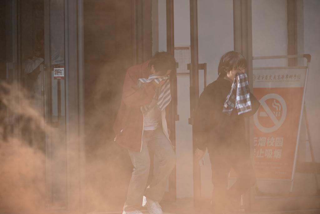 演练是从火灾警报响起时开始,公寓内学生听到警报声纷纷跑出寝室,用湿毛巾捂住口鼻,弯腰跑向楼梯口和公寓门口,在各楼层楼梯口和公寓楼门口有辅导员老师组织学生有序疏散,学生跑出公寓楼后到一号公寓前广场集合。整个疏散演练过程平稳有序。
