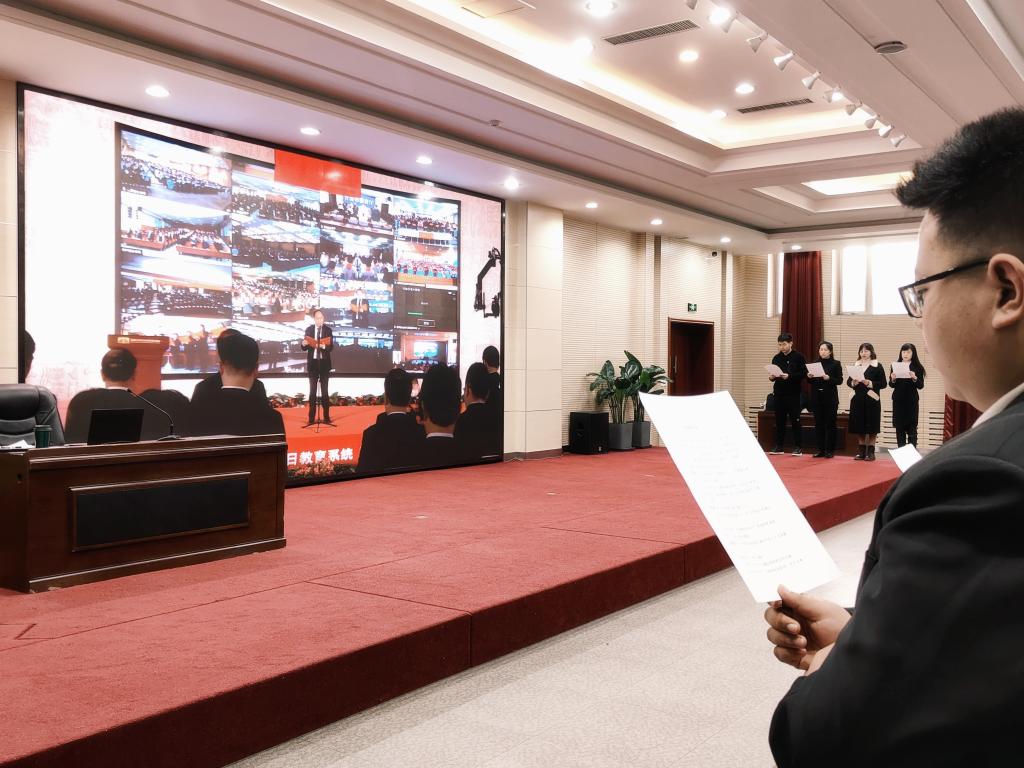上午9时30分,党政办公室(法制办公室)管奇、陈香卉老师,马克思主义学院戴茹、李萌旸老师带领学生参与宪法晨读活动,观看普法网直播同步举办升旗仪式、进行宪法晨读、合唱宪法主题歌曲《宪法伴我们成长》、观看现场展演等,让学生体会宪法温度、感受宪法力量,大力弘扬宪法精神。