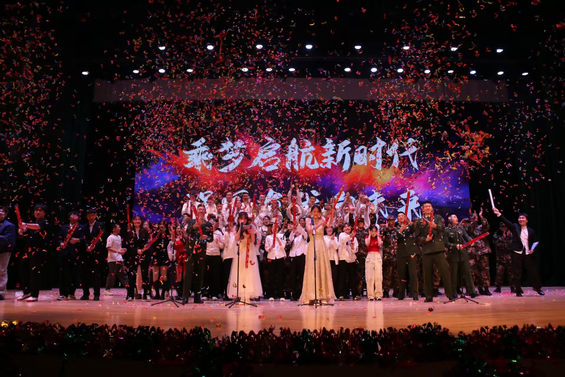 20241212日,信息工程系“乘梦起航新时代 强国有我向未来”迎新晚会在学校礼堂隆重举行。晚会现场气氛热烈,灯光璀璨,舞台上张灯结彩,洋溢着浓厚的节日氛围。
