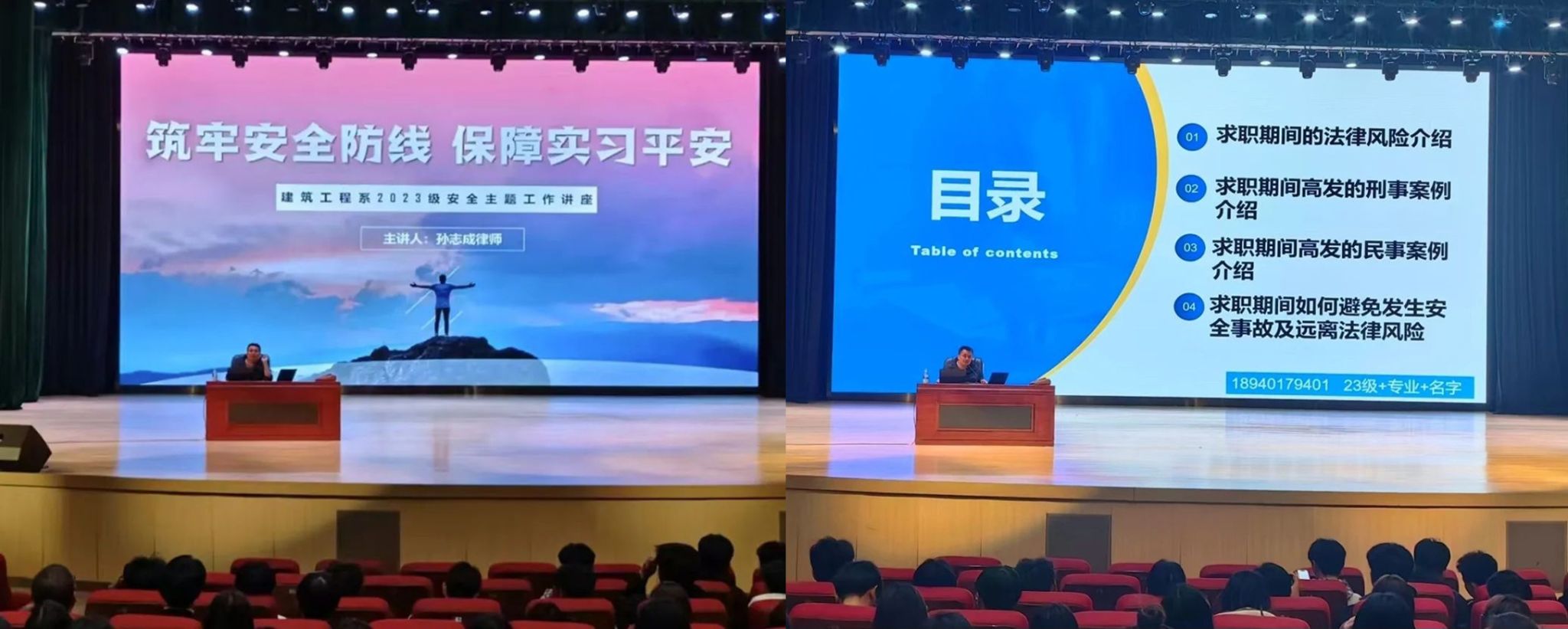 提高2023级学生在校外实习期间的安全教育面对实习期间防范法律风险能力,建筑工程系324日在学生综合素质教育中心礼堂开展以筑牢安全防线 保障实习安全”为主题的学生安全教育讲座,特聘请上海海华永泰(沈阳)律师事务所律师为同学们讲授专业法律知识,求职期间的法律风险、高发的刑事案例高发的民事案例以及如何避免发生安全事故及远离法律风险等四方面进行了详细讲解提升学生自我保护意识和能力通过典型的实际案例讲解,详细分析案例中的违法行为、危害后果以及法律责任,有效提升了学生的法律风险防范意识和依法维权能力,引导学生树牢“安全第一”意识,为职业生涯筑牢安全防线