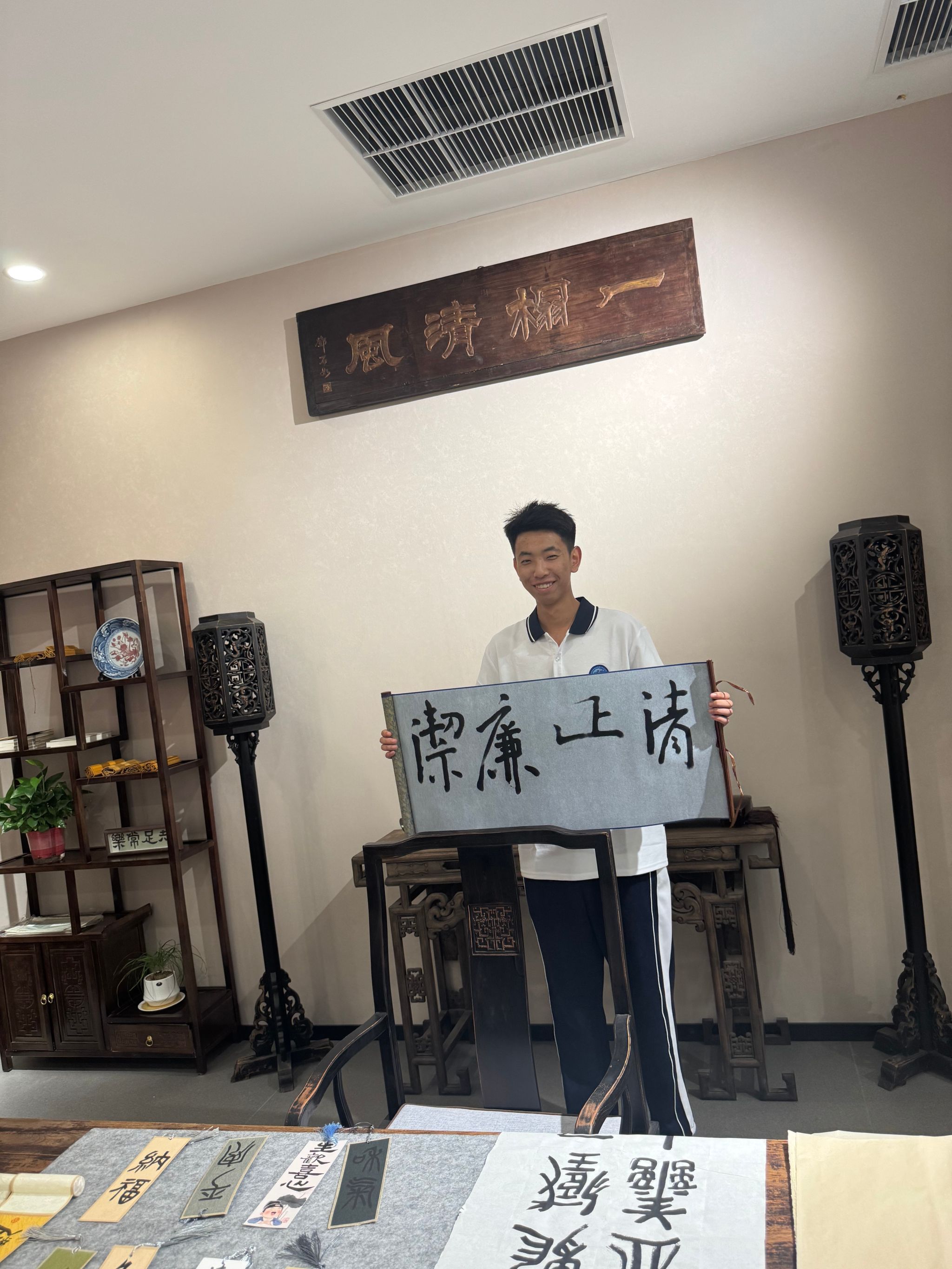 活动特别设置廉洁文化互动环节,师生通过书法创作,将廉洁文化理念转化为艺术实践。入党积极分子唐磊写下“清正廉洁”四个字,他表示:“测绘人的‘经纬’不仅是坐标轴,更是人生的准则。只有行得正、测得准,才能不负时代使命。”