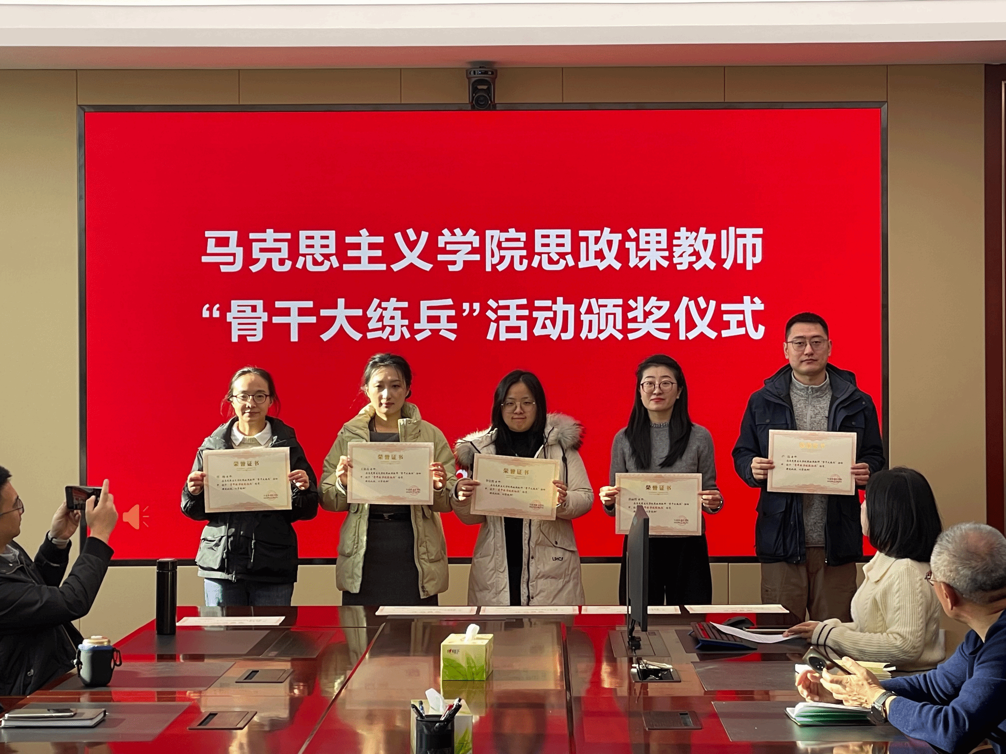 会议首先为在学院第二届思政课教师“骨干大练兵”活动中荣获“青年教学技能标兵”称号及“优秀课件”“优秀案例”单项奖的教师颁奖。学院党总支书记李玉巧、院长戴茹、党总支副书记李萌旸及各教研室评审成员为获奖教师颁发荣誉证书。