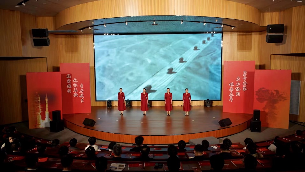 绵阳市梓潼县曾是中国工程物理研究院院部所在地,原子弹、氢弹设计方案在此相继完成,11日下午,以“两弹一星”元勋事迹为蓝本创作的红色情景剧《英雄·丰碑》在南校区会议中心101报告厅进行展演,该剧通过沉浸式、互动性的演绎,深切回望邓稼先、钱学森、王淦昌等老一辈科学家胸怀祖国、赤诚奉献的家国情怀,生动诠释了“热爱祖国、无私奉献,自力更生、艰苦奋斗,大力协同、勇于登攀”的“两弹一星”精神,激励和感召广大青年学子坚定理想信念,投身航天报国。