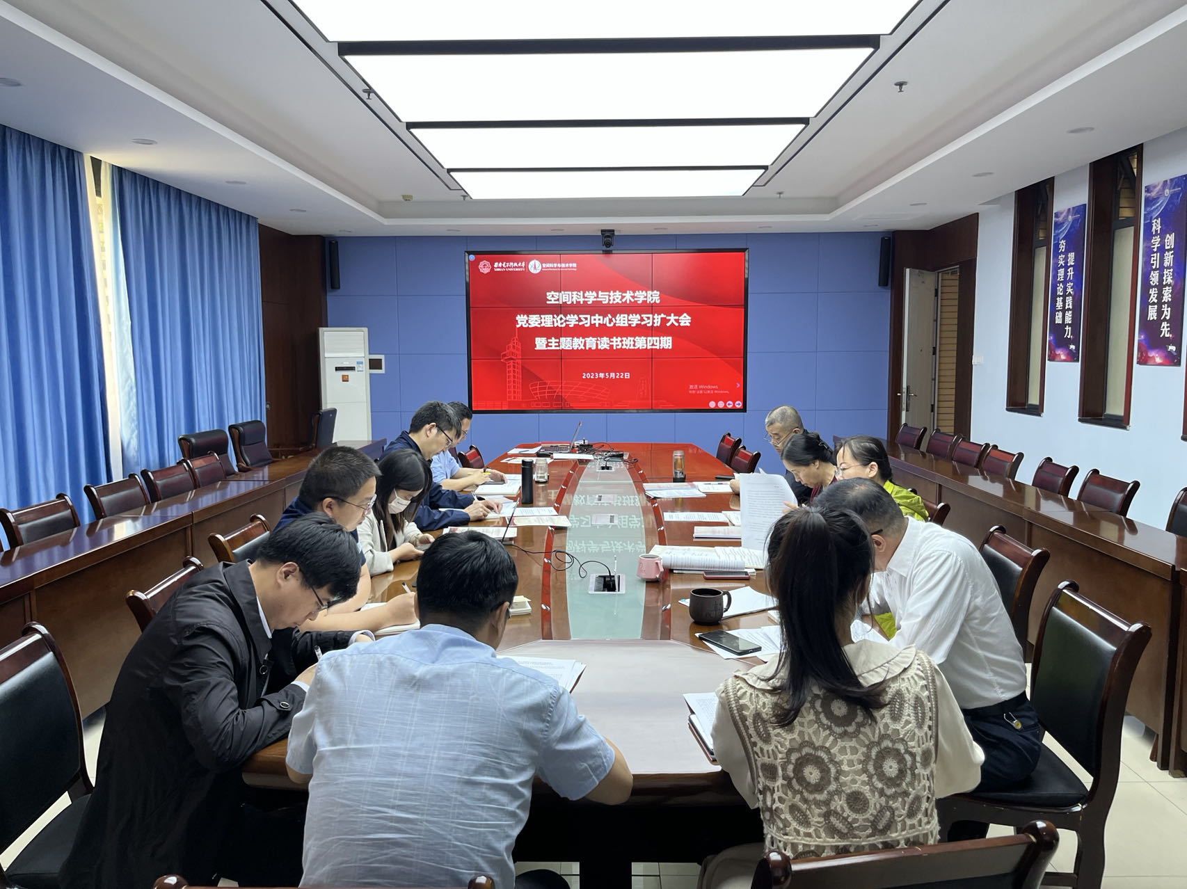 (通讯员 范雪琦)5月22日上午,空间科学与技术学院党委理论学习中心组召开扩大学习会议暨学习贯彻习近平新时代中国特色社会主义思想主题教育第四期读书班,传达学习习近平总书记重要讲话和重要指示批示精神。学院领导班子、党委委员、教师支部书记、学生支部书记代表参加会议,会议由学院党委书记朱伟主持。