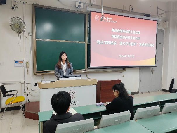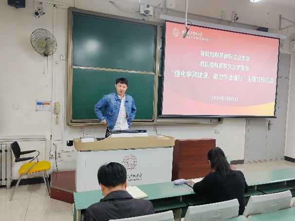 随后,导航控制系教职工党支部书记戴浩老师对探测制导与控制技术专业的现状进行了深入剖析。他简要分析了各年级学生的学习状况,着重强调了本科阶段学习的重要性和当前学业提升的紧迫性,并向大家详细介绍了学院为提升本科生学业水平所采取的一系列举措,重点向大家介绍了“探测专业学生学业提升计划”,该计划拟通过建立学业互助小组,从学业规划、科研引导、就业指导、心理疏导等方面开展工作,根据学生个性化需要,优化学业帮扶结构,开展英语打卡、高数学业辅导等活动,补短板强弱项,促进本科生学业水平的整体提升。