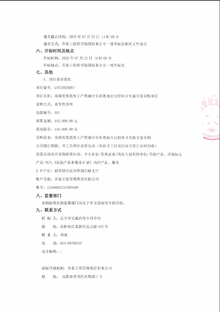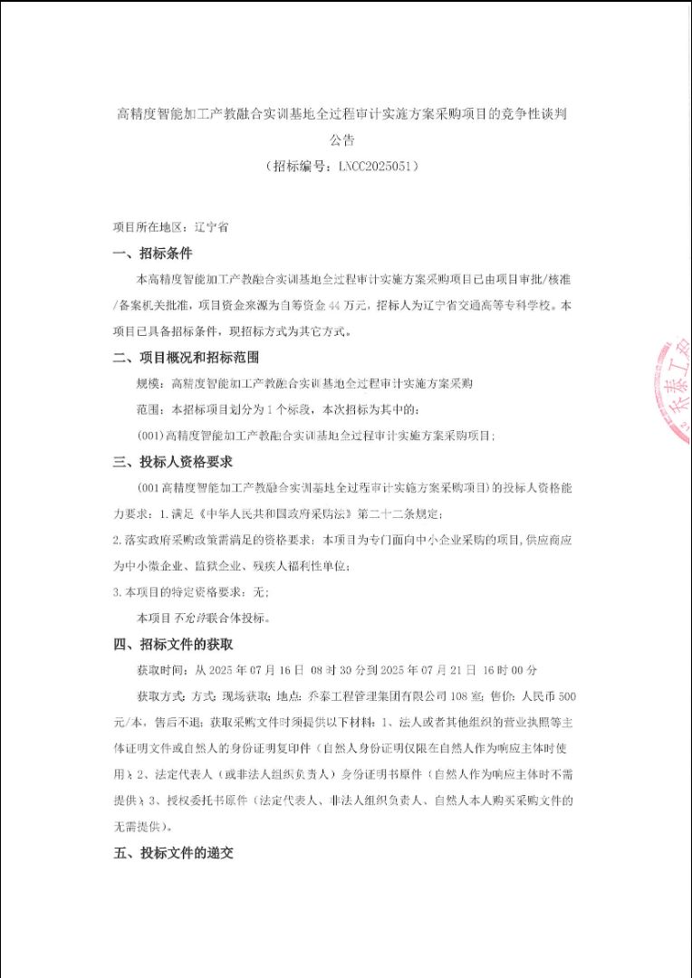 高精度智能加工产教融合实训基地全过程审计实施方案项目竞争性谈判公告(LNCC2025051)